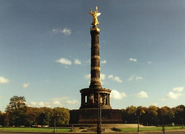SiegessäuleDie Siegessäule wurde 1873 errichtet zur Erinnerung an die drei Siege Preußens in den Kriegen gegen Dänemark 1864, gegen Österreich 1866 und gegen Frankreich 1870/71. Die Aussichtsplattform befindet sich unterhalb der 8 m hohen bronzenen, vergoldeten Viktoria des Bildhauers Friedrich Drake, die auch als "Goldelse" bekannt ist. Die Siegessäule steht am "Großen Stern" inmitten des Parks Tiergarten. |