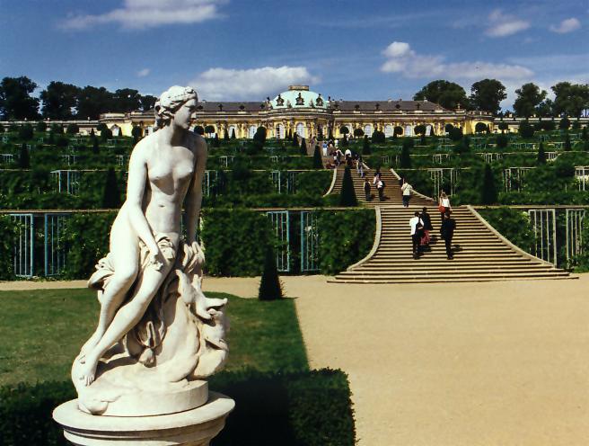 Schloss Sanssouci in PotsdamDas berühmte Schloss Sanssouci wurde 1747 als Sommersitz Friedrichs des Großen erbaut. Im umliegenden Park Sanssouci befinden sich weitere interessante historische Bauten, darunter auch das Neue Palais. Am Fuß der Weinbergterrassen liegt das Französische Rondell mit Springbrunnen und Skulpturen französischer Bildhauer. Im Bild ist die Venus von Jean Baptiste Pigalle zu sehen. |